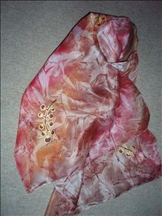 Šála Ponge 6 s třásněmi, rozměr 40x160 cm, v růžovových a fialových barvách. Ozdobena motýly v různých velikostech s nažehlenými kovovými ozdobami.