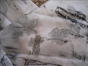 Šála Ponge 5, rozměr 35/130 cm, v hnědých tónech s kytko/lístečky malovanými zlatou konturou. Na některých kytkách jsou nažehleny Swarovski HOT-FIX kamínky v hnědé barvě.