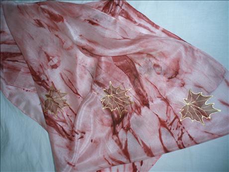Šálka Ponge 5, rozměr 35x130 cm, v hnědo-červených tónech s lístky se zlatou konturou.