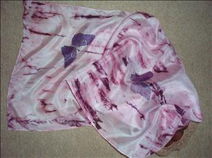 Šála Ponge 5, rozměr 35/130cm, v růžovových tónech s motýly v barvě růžovo-fialové se stříbrnou konturou.