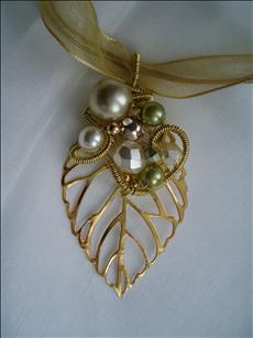 Přívěšek s velkým ozdobným kovovým korálkem, řetízky a voskovými perlami. Zavšeno na světle zelené saténové stuze.