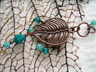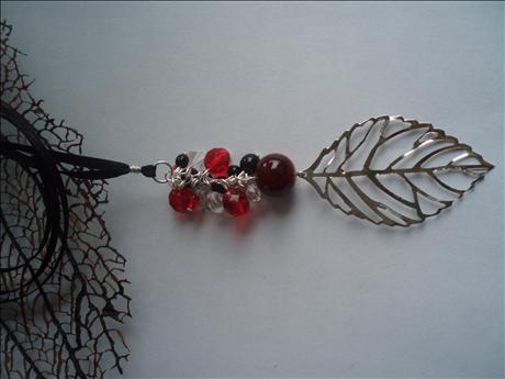Kovový list doplněný o čevené a čiré ohňovky, černé korálky a velký červeno-černý korálek. Zavěšeno na červné saténové stuze.