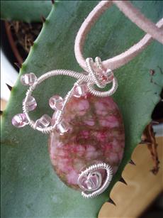 Přívěšek s velkým ozdobným korálkem, hroznem voskových perel, zavěšeno na saténové stuze v růžové barvě.